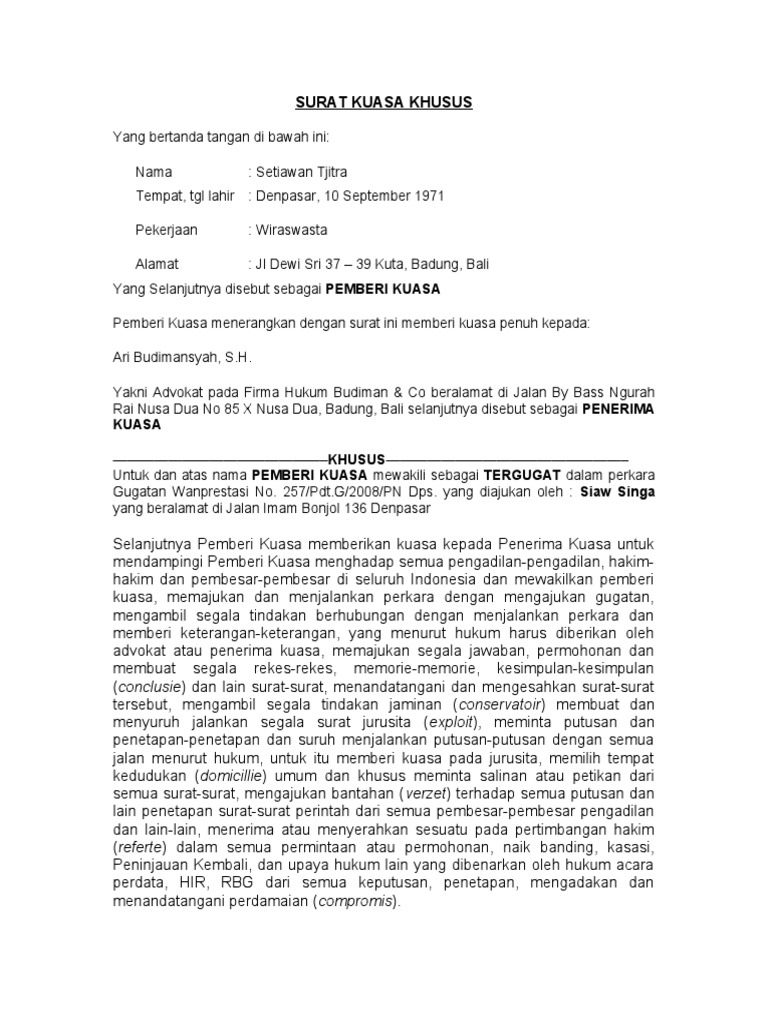 Contoh Surat Kuasa Khusus Perdata Wanprestasi Pdf